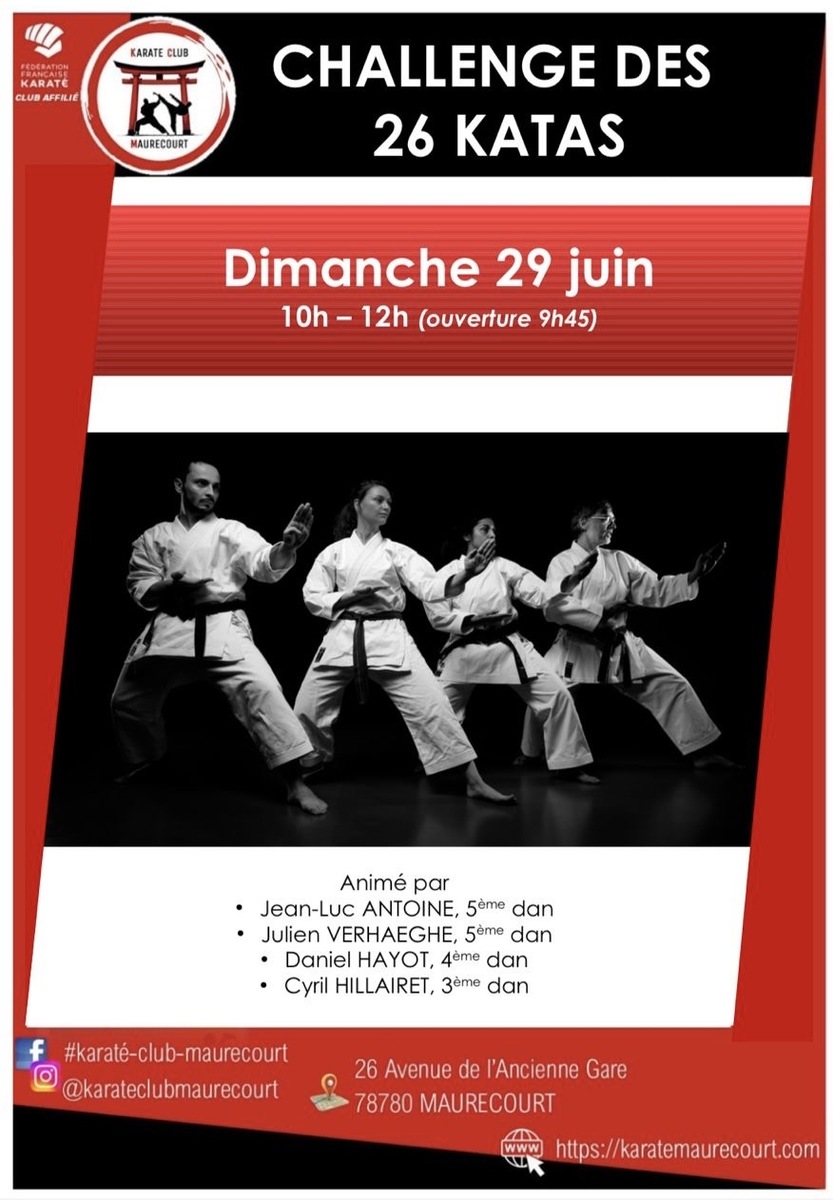 Pour finir la saison en beauté, Jean-Luc ANTOINE (5eme Dan), Julien VERHAEGHE (5eme Dan), Daniel HAYOT (4eme Dan) et Cyril HILLAIRET (3eme Dan) seront heureux de vous accueillir au Dojo du Karaté Vlub Maurecourt pour dérouler durant 2 heures les 26 katas traditionnels Shotokan.