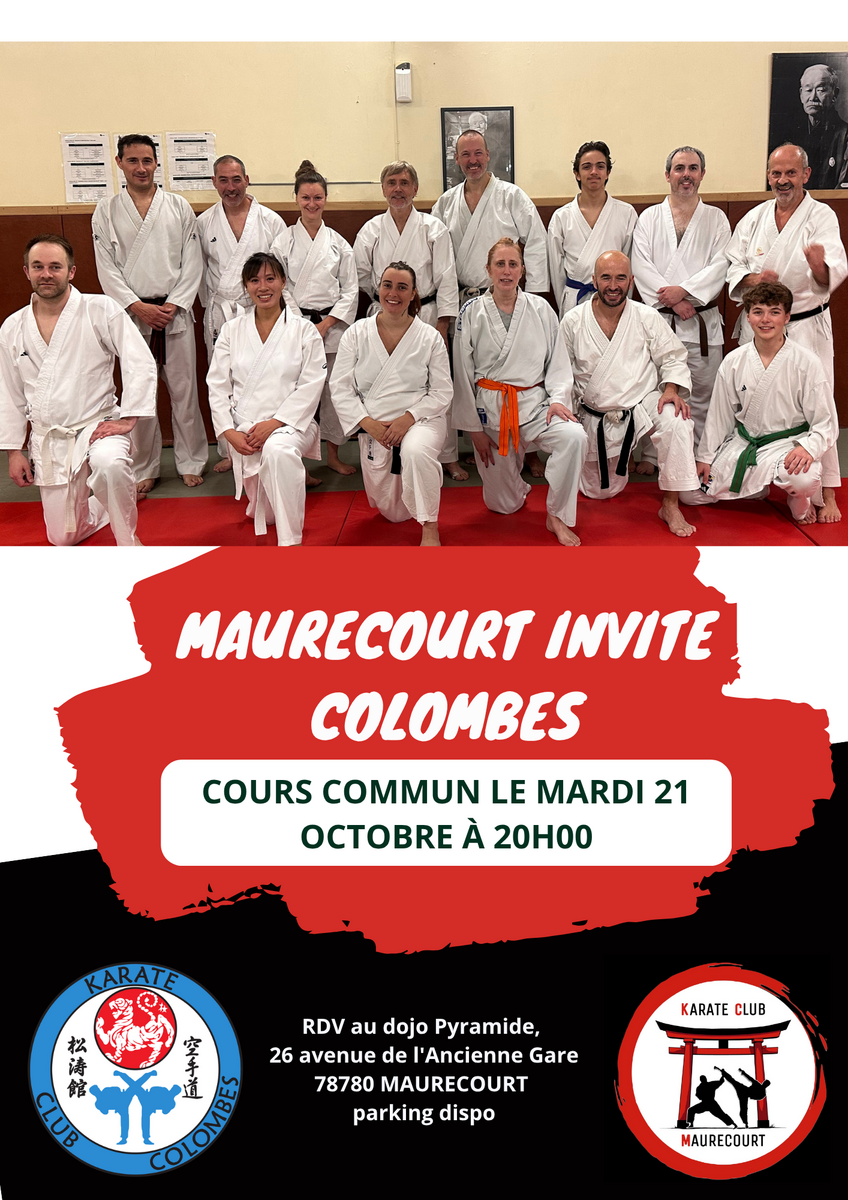 Le Karaté Club Maurecourt invite le Karaté Club Colombes à un cours commun le 21/10. Ce cours, encadré par Julien et Jean-Luc aura pour objectif le travail d'un kata supérieur et les bunkais qui vont avec.